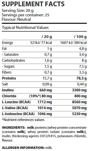 Incluye una combinación de concentrado y aislado de proteína de suero de leche. Se trata de dos fuentes de gran biodisponibilidad y con diferente velocidad de digestión, para un aporte de aminoácidos constante en el tiempo. Además el suero de leche está compuesto por beta-lactoglobulina, alfa-lactoalbúmina, albúmina de suero bovina, lactoferrina, inmunoglobulinas, glicomacropeptidos, lactosa, lactoperoxidasas y minerales.