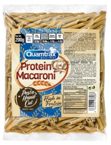 Protein Macaroni de Quamtrax Gourmet son unos macarrones de pasta elaborados a base de una mezcla de proteínas, harina de trigo integral, harina de soja, proteína de arroz y fibra de avena.