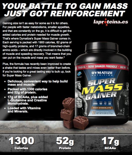 Super Mass Gainer de Dymatize Nutrition es un ganador de peso muy energético ideal para ayudar a desarrollar y mantener la masa muscular especialmente en deportistas de gran peso con necesidades energéticas elevadas.