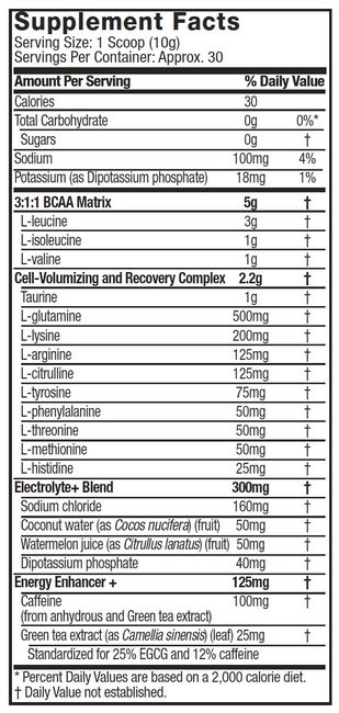 3:1:1 BCAA Matrix (L-Leucina, L-Isoleucina, L-valina), Cell-Volumizing and Recovery Complex (Taurina, L-Glutamina, L-Lisina, L-Arginina, L-Citrulina, L-Tirosina, L-Fenilalanina, Treonina, L-metionina, L-Histidina), Electrolyte Blend (Cloruro de sodio, Agua de coco (Fruto de Cocos nucifera), Zumo de sandía, Fosfato Dipotásico), Energy Enhancer (Cafeína de extracto de Té verde, extracto de Té Verde (Camellia sinensis)(Hoja).