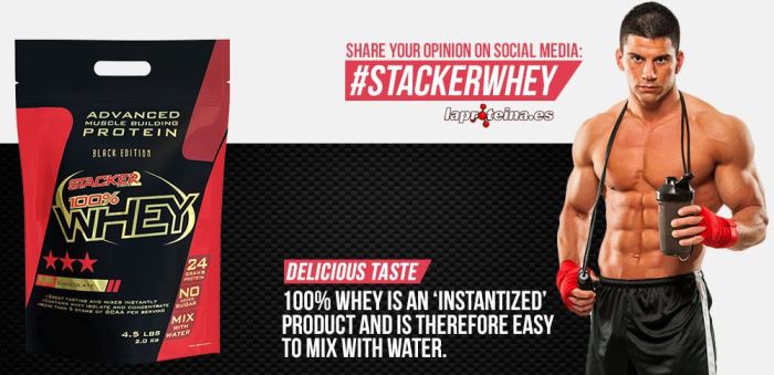Puedes elegir entre cientos de proteínas, cada una con una composición diferente. ¿Qué es lo que buscas? ¿Cuál es tu objetivo? Si tu meta es desarrollar tu masa muscular y no la grasa, de poco te servirán las proteínas con un bajo porcentaje proteico y con un 40% de carbohidratos. Lo que tú necesitas es un producto que se ajuste al 100% a tus objetivos. Lo que tú necesitas es 100% Whey de Stacker2 Europe.