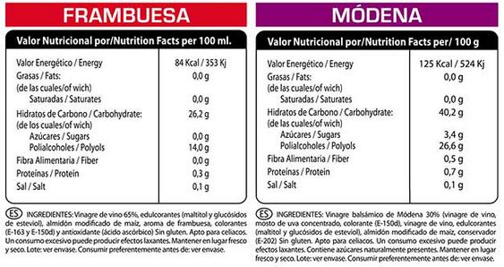 Sabor Módena: Vinagre de vino 30% (vinagre de vino, mosto de uva concentrado, colorante (E-150d), vinagre de vino, edulcorantes (malitol y glucosidos de esteviol), almidón modificado de maíz, conservador (E-202).