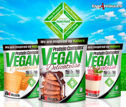 Protein Complex Vegan Delicatesse de Beverly Nutrition es un suplemento en polvo que contiene una mezcla de proteínas vegetales del más alto valor biológico, procedente de guisante y arroz, que además está enriquecida con el complejo "Exclusive Superfood Mix" que incluye quinoa, chlorella, semillas de chía, spirulina, moringa, psyllium y salvado de trigo.