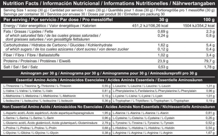 También contiene una alta concentración de glutamina, lisina y BCAAs, y por tanto es parecida a la proteína de suero aunque con una cantidad más relevante de arginina que la del suero.