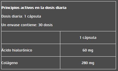 - Proporciona 60 mg de ácido hialurónico y 280 mg de colágeno marino por dosis.