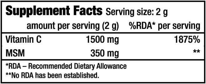 - Proporciona 350 mg de metilsulfonilmetano con 1.500 mg de vitamina C por dosis de 2 gramos.