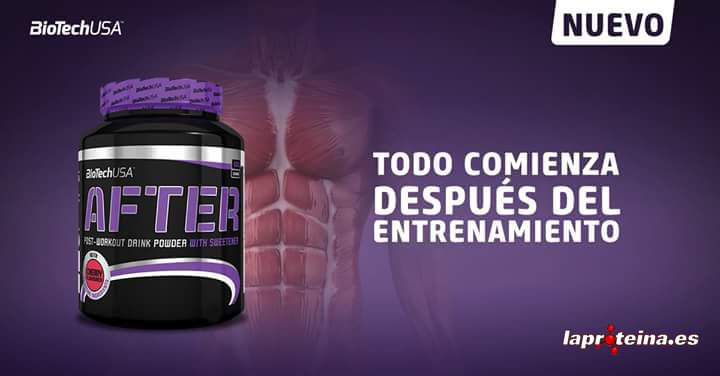 After de BioTech USA es un suplemento en polvo diseñado específicamente para después del entrenamiento que contiene glutamina, HMB, BCAAs y otros aminoácidos esenciales, monohidrato de creatina micronizado, extracto de rhodiola rosea, ácido alfa lipoico, vitaminas, minerales y carbohidratos de diferente índice glucémico que contribuyen de forma sinérgica a potenciar los procesos de recuperación y reparación muscular tras el entrenamiento físico intenso.