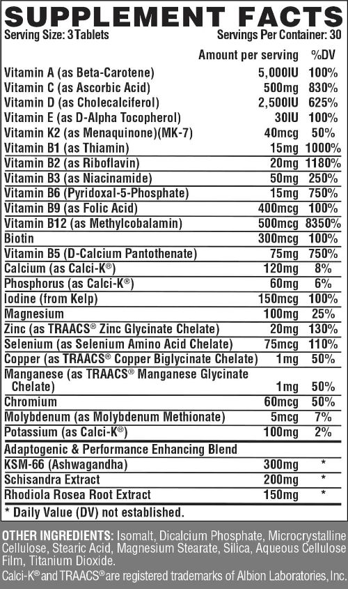 Vitamina A (como betacaroteno), Vitamina c (como ácido ascórbico), Vitamina d (como colecalciferol), Vitamina e (como d- Alpha tocopherol), Vitamina K2 (como Menaquinona) (MK-7), Vitamina b1 (como tiamina), Vitamina b2 (como riboflavina), Vitamina b3 (como niacinamida), Vitamina b6 (piridoxal-5-fosfato), Vitamina b9 (como ácido fólico), Vitamina b12 (como metilcobalamina), Biotina, Vitamina b5 (pantotenato de calcio d), Calcio (como Calci-K), Fósforo (como Calci-K), Yodo (de algas), Magnesio, Zinc (como traacs quelato glicinato de zinc), Selenio (como el quelato de selenio aminoácido), Cobre (como TRAACS Cobre bisglicinato quelado), Manganeso (como traacs manganeso glicinato quelado), Cromo, Molibdeno (como molibdeno metionato), Potasio (como Calci-K), Mezcla mejoradora de rendimiento y adaptatogénica (KSM-66 (Ashwagandha), Extracto de schisandra, Extracto de raíz de Rhodiola rosea).