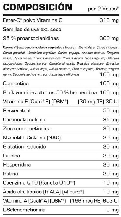 Ácido L-Ascórbico (vitamina C), extracto seco de semillas de uva (vitis vinifera) 95% proantocianidinas, espesante (cápsula): hidroxipropilmetilcelulosa, extracto seco mezcla de vegetales y frutas (Vitis vinifera, Citrus sinensis, citrus paradisi, vaccinium myrtillus, carica papaya, ananas sativus, fragaria vesca, pyrus malus, prunus armeniaca, prunus avium, ribes nigrum, solanum lycopersicum, daucus carota, camelia sinensis, brassica oleracea, brassica oleracea capitata, allium cepa, allium sativum, olea europea, triticum vulgare germ, cucumis sativus extract, asparagus officinalis), quercetina, bioflavonoides cítricos (citrus sinensis) 50% hesperidina, acetato de DL-alfa tocoferilo (vitamina E), resveratrol, carbonato cálcico, monometionina de zinc, N-acetil L-cisteína, glutation reducido, antiaglomerante: esterato de magnesio, luteína, hesperidina, rutina, conezima Q10, ácido alfa-lipoico, colorante (cápsula): dióxido de titanio, acetato deretinilo (vitamina A), selenometionina.