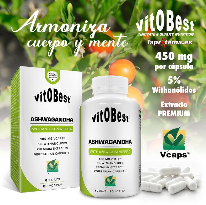 Ashwagandha de Vitobest es un suplemento en cápsulas que proporciona 450 mg de extracto de ashwagandha (Withania somnifera) por dosis de 1 cápsula, estandarizado a un 5% en whitanólidos, a día de hoy la cantidad máxima obtenida para este principio activo.