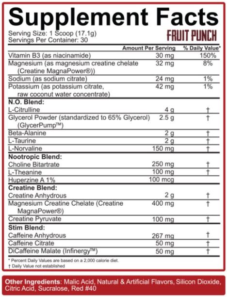 Mezcla de N.O. (L-citrulina, glicerol en polvo como Glycerpump™ (estandarizado para 65% de glicerol), beta alanina, L-taurina, L-norvalina), Mezcla de nootrópicos (bitartrato de colina, L-teanina, huperzina A (1%)), Mezcla de creatinas (creatina anhidra, quelato de creatina y magnesio (como Creatina MagnaPower®), piruvato de creatina), Mezcla estimulante (Cafeína anhidra, citrato de cafeína, malato de dicafeína (como Infinergy™), vitamina B3 (como Nicotinamida), Magnesio (como quelato de creatina y magnesio (Creatina MagnaPower®), sodio (como citrato de sodio), Potasio (como citrato de potasio), concentrado de agua de coco natural.