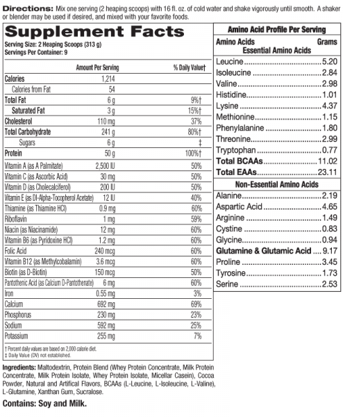 Maltodextrina, concentrado de proteína de suero de leche, concentrado de proteína de la leche, aislado de proteína de leche, proteína de suero aislado, caseína micelar, cacao en polvo, sabores naturales y artificiales, BCAAs (L-leucina, L-isoleucina, L-valina), L-Glutamina, goma de xantano, sucralosa.