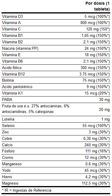 Fosfato de calcio dibásico; estabilizador: celulosa microcristalina; óxido de magnesio ; ácido ascórbico (vitamina C); gluconato de hierro; ácido para-aminobenzóico (PABA); gluconato de zinc; levadura de selenio; nicotinamida (niacina); gluconato de zinc; uva (Vitis vinifera, frutas) extracto seco titulado 27% antocianidinas, 6% antocianinas, 5% catequinas (Vitis Biocomplex)*; luteína de Caléndula officinalis; acetato de dl-alfa-tocoferol (vitamina E); agentes de recubrimiento: ácido hidroxipropilmetilcelulosa, esteárico; agentes antiplaquetarios: dióxido de silicio y estearato de magnesio; calcio D-pantotenato (ácido pantoténico); gluconato de manganeso; fluoruro de sodio; gluconato de cobre; riboflavina (vitamina B2); clorhidrato de piridoxina (vitamina B6); clorhidrato de tiamina (vitamina B1); acetato de retinilo (vitamina A); ácido pteroilmonoglutámico (ácido fólico); picolinato de cromo; D-biotina; yoduro de potasio; fitomenadiona (vitamina K1); colecalciferol (vitamina D3); cianocobalamina (vitamina B12).