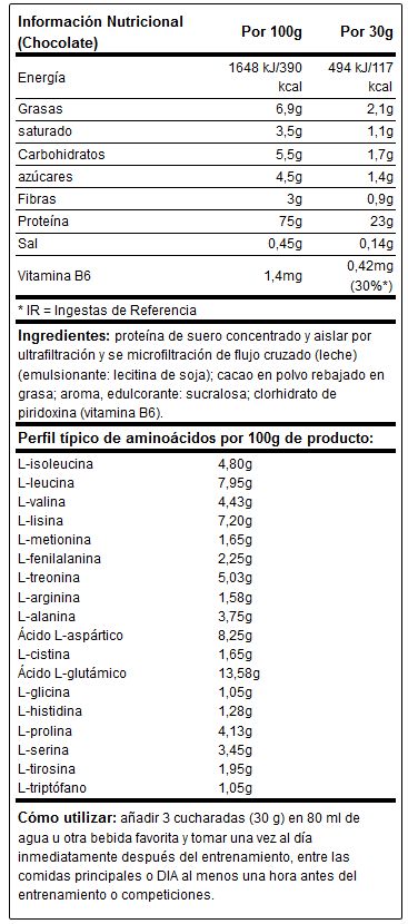 Ultra Whey Complex presenta un contenido proteico del 79% en el caso del sabor a vainilla y del 75% en el del sabor a chocolate.