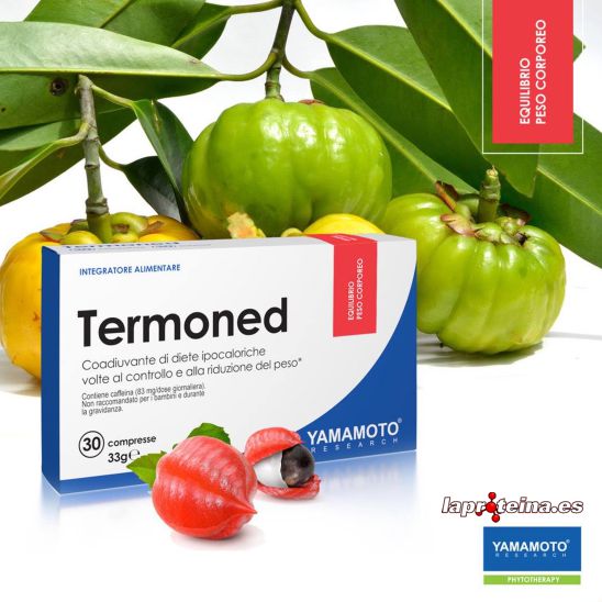 Termoned® de Yamamoto® Nutrition es un suplemento en tabletas a base de extractos vegetales (garcinia, naranja amarga, cóleo, guggul, sauce blanco, guaraná) y cafeína, con vitaminas B1, B2 y B2, diseñado para ayudar a una reducción y control del peso en dietas hipocalóricas.