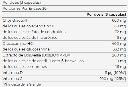 ChondrActiv® (55% colágeno de tipo II, 12% condroitín sulfato y 1% ácido hialurónico de cartílago de pollo hidrolizado), glucosamina HCl, cápsula (agente de recubrimiento: hidroxi propilmetilcelulosa; colorante: dióxido de titanio), BosLIQ® AKBA [extracto seco de Boswellia (Boswellia sacra Flueck sin. Boswellia carteri Birdw) resina de goma 50 g/kg ácido acetil-11-ceto-β- boswéllico (AKBA), 80 g/kg cembrenes], ácido L-ascórbico (vitamina C), antiaglomerantes: sales magnésicas de ácidos grasos, dióxido de silicio; colecalciferol (vitamina D).
