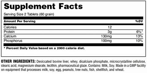 Hígado bovino desecado, suero de leche, fosfato dicálcico, celulosa microcristalina, ácido esteárico, estearato de magnesio, lecitina (soja).