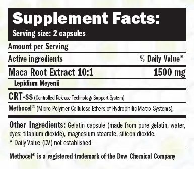 Raíz de maca extracto, cápsula de gelatina (A base de gelatina pura, agua, colorantes: Dióxido de titanio), methocel (Micro-polímero hidrofílico éteres de celulosa de sistemas de matriz), estearato de magnesio, dióxido de sicilio.