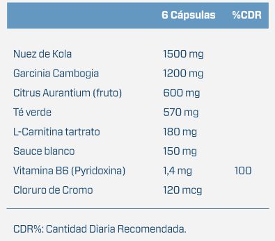Nuez de Kola, Garcinia Cambogia (fruto), gelatina (cápsula vacía), Citrus aurantium (fruto), té verde, L-Carnitina Tartrato, sauce blanco, vitamina B6 (piridoxina), cloruro de cromo (III), antiaglomerante (estearato de magnesio).