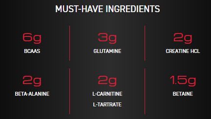 L-Glutamina; creatina HCl (como CON-CRET®), Beta-alanina, L-Carnitina L-Tartrato (como Carnipure™), Betaína (trimetilglicina), Taurina, L-Leucina, L-isoleucina; L-valina, extracto de fruto de la pimienta negra (Piper nigrum) (como BioPerine®).