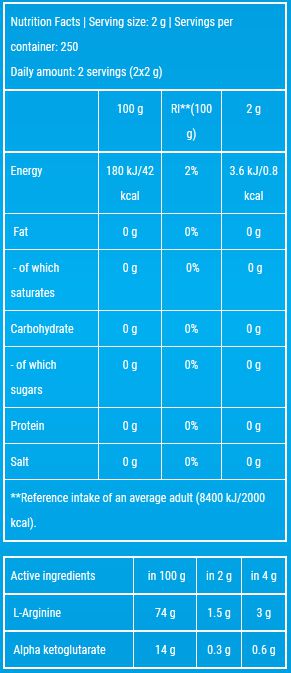 L-Arginina alfa cetoglutarato 50%, L-Arginina clorhidrato 50%.