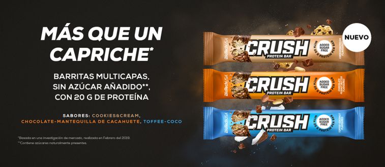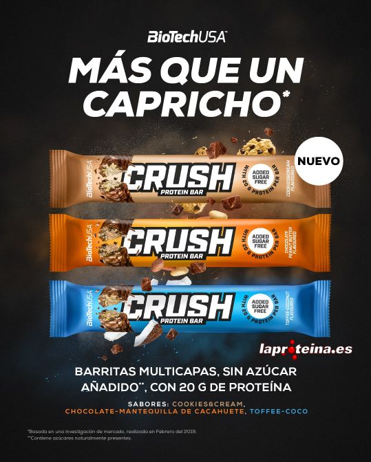 Las nuevas barritas Crush Protein Bar de BioTech USA son unas deliciosas barritas multicapas de 64 gramos altas en proteínas y sin azúcares añadidos que se presentan en 3 exquisitas versiones con sabor a cookies & cream, chocolate-mantequilla de cacahuete y o toffe-coco.