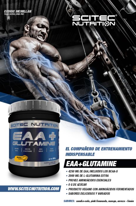 EAA + Glutamine de Scitec Nutrition es un suplemento en polvo que contiene una fórmula avanzada que proporciona 4.250 mg de aminoácidos esenciales en combinación con 2.000 mg de glutamina por dosis de 9 gramos.