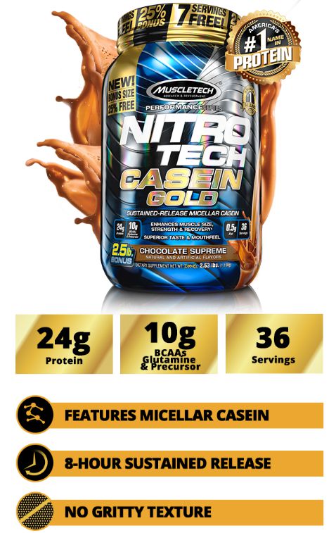Nitro Tech™ Casein Gold está especialmente recomendada para aquellas personas que buscan un proteína para tomar por la noche, con el fin de evitar el catabolismo muscular; o para tomar después del entrenamiento buscando la mayor síntesis proteica ya que, gracias a su alto peso molecular, la caseína requiere de 6 a 8 horas para ser digerida y absorbida por completo. También puede ser muy útil parta aquellas personas que sufren ansiedad por la comida durante las horas de la noche.