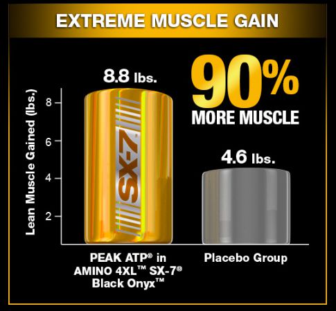 Amino 4XL SX-7 Black Onyx también contiene la fórmula patentada PEAK ATP®, conocida por aumentar el rendimiento físico y la fuerza, y mejorar la recuperación. Peak ATP® es un compuesto que utiliza una tecnología de nueva generación que aporta al organismo humano la molécula exacta (adenosina trifosfato o ATP) necesaria para crear energía. Los principales efectos de Peak-ATP® son que eleva los niveles de ATP en la sangre y en los tejidos; mejora la entrega de la glucosa, los nutrientes y el oxígeno durante el entrenamiento físico; mejora la recuperación de los músculos; y ayuda a eliminar los desechos metabólicos; regula el tono vascular para reducir la resistencia vascular pulmonar y sistémica, sin afectar la presión arterial o al ritmo cardíaco y aumenta el flujo sanguíneo cerebral. Peak ATP® permite aumentar la cantidad de ATP en el organismo sin necesidad de ingerir más cantidad de alimento. Varios estudios clínicos realizados con Peak ATP® han demostrado que es capaz de aumentar la fuerza, la energía y retrasar la aparición de la fatiga. Peak ATP® también demostró que es capaz de mejorar la reserva de glucosa, nutrientes y oxígeno de los músculos favoreciendo la eliminación de los desechos catabólicos lo que mejora la recuperación muscular.