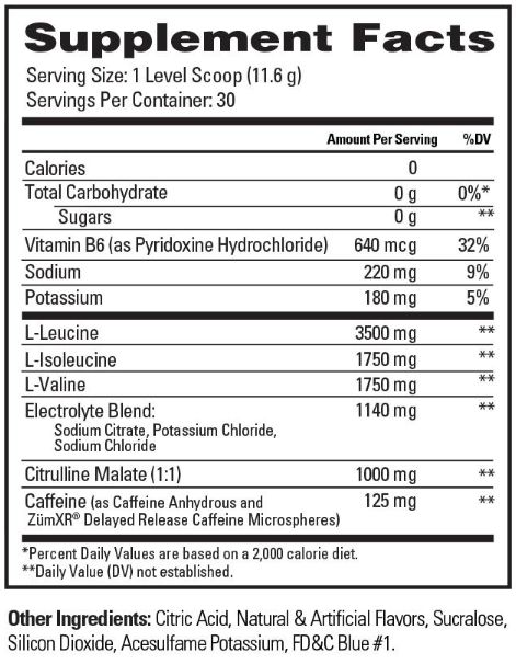 L-Leucina, L-Isoleucina, L-valina, Mezcla de Electrolitos (Citrato Sódico, Cloruro de Potasio, Cloruro de sodio), Malato de Citrulina, cafeína (como cafeína anhidra y ZumXR® microesferas de cafeína de liberación retardada).