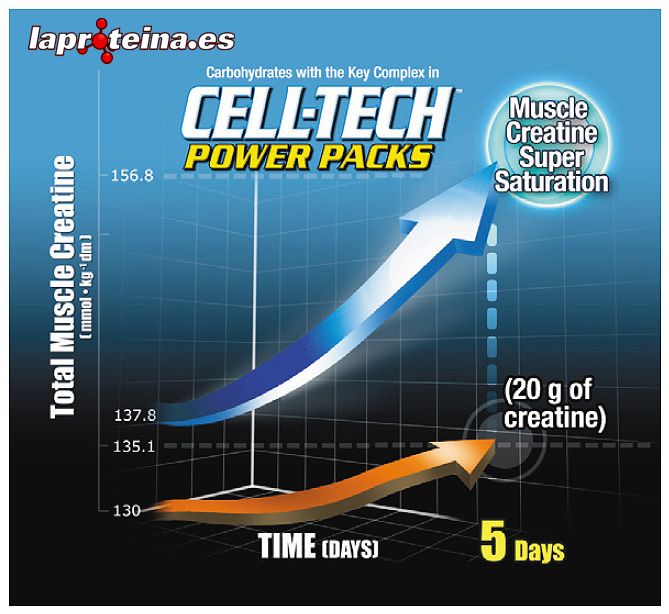 Después de 5 días en un estudio de doble ciego realizado con 16 personas divididas en 3 grupos, se comprobó que el complejo clave de Cell-Tech Power Packs combinado con una bebida de carbohidratos era más eficaz a la hora de llevar creatina a los músculos que 20 gramos de creatina normal en polvo (19 vs. 5,1 mmol • kg-1 dm).