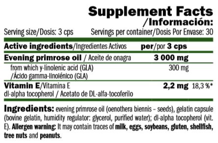 - Proporciona 3.000 mg de aceite de onagra con vitamina E por dosis de 3 perlas.