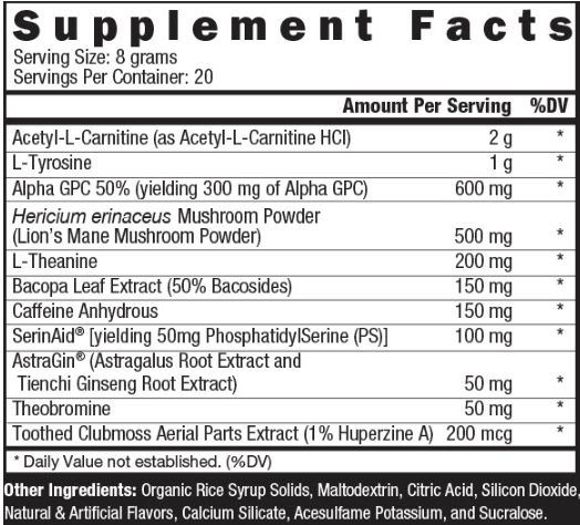 Acetil-L-Carnitina (como Acetil-L-Carnitina HCl) L-Tirosina Alpha GPC 50% (produciendo 300 mg de Alpha GPC) Polvo de hongo Hericium erinaceus (Polvo de hongo melena de león) Extracto de hoja de L-teanina Bacopa (50% de bacósidos) SerinAid® de cafeína anhidra [que produce 50 mg de fosfatidilserina (PS)] AstraGin® (extracto de raíz de astrágalo y extracto de raíz de ginseng de Tienchi) Extracto de partes aéreas de musgo dentado de teobromina (1% de huperzina A)