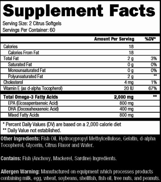 2.000 mg de ácidos grasos omega 3 con vitamina E por dosis. Con 800 mg de EPA y 400 mg de DHA.