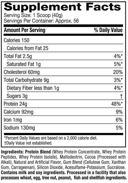 Mezcla de proteína (concentrado de proteína de suero, péptidos de proteína de suero, aislado de proteína de suero) maltodextrina, cacao (procesado con alcali), saborizantes naturales y artificiales, mezcla de gomas (goma de celulosa, goma xantana, goma carragenina), dióxido de silicio, acesulfamo potásico y sucralosa.