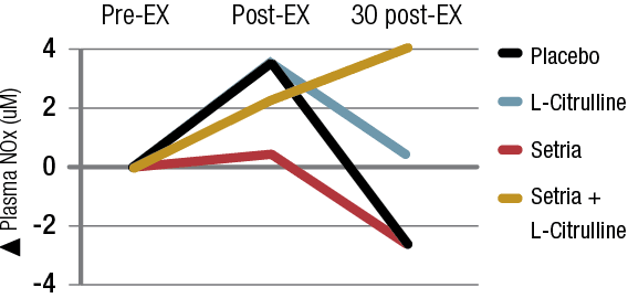 Con una semana de suplementación oral con 200 mg de Setria y 2 gramos de L-Citrulina al día se consiguió aumentar los niveles de ON a los 30 minutos después del ejercicio.