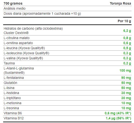 Dextrina cíclica altamente ramificada (Cluster Dextrin®), Yamamoto ENO-1™ - Energy Nitric Oxide Precursor: L-citrulina malato, aspartato de L-ornitina, L-leucina (Kyowa Quality®), L-isoleucina (Kyowa Quality®), L-valina (Kyowa Quality®), taurina, aroma, citrato de potasio, L-alanil-L-glutamina (Sustamine®), citrato de magnesio, corrector de acidez: ácido cítrico; L-fenilalanina, glutatión reducido Setria®, clorhidrato de Llisina, edulcorantes: acesulfamo K, sucralosa; L-histidina, L-triptófano, estabilizantes: sucroésteres de ácidos grasos, hidroxipropilmetilcelulosa; jugo concentrado de zanahoria violeta en polvo, Lmetionina, L-treonina, clorhidrato de piridoxina (vitamina B6), cianocobalamina (vitamina B12).