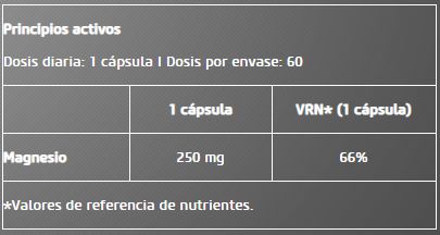- Proporciona 250 mg de magnesio activo por dosis de 1 cápsula.