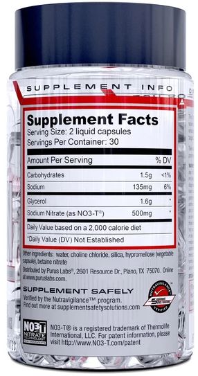 NOXygen™ de Purus Labs es un suplemento en cápsulas líquidas libre de estimulantes diseñado para proporcionarte un increíble bombeo muscular gracias a la combinación sinérgica de 3 compuestos muy avanzados de óxido nítrico: glicerol, nitrato de soldio NO3-T® y nitrato de betaína.