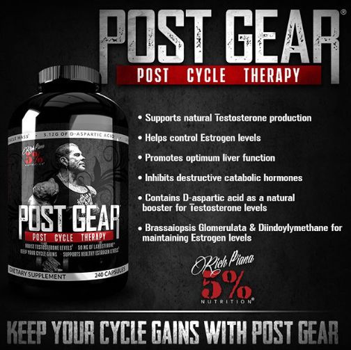 Where can you get a complete PCT formula that covers all of these requirements? There's no other choice than Post Gear by Rich Piana 5% Nutrition! No one knows hardcore better than 5%! Post Gear has everything you need for the most effective post cycle therapy program possible – testosterone support, estrogen inhibitors, liver support, and cortisol regulation. That means you stay healthy and bring your hormones back into balance so you can keep your gains!