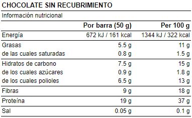 Barritas de 50 gramos con un 37% de proteína de alto valor biológico. Sin recubrimiento de chocolate.