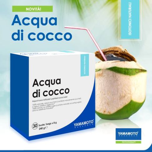 Agua de Coco de Yamamoto® Nutrition es un suplemento en polvo presentado en sobres individuales que proporciona agua de coco liofilizada sin azúcares añadidos, una bebida que permite una rehidratación perfecta y proporciona energía, ya que es una bebida isotónica natural.