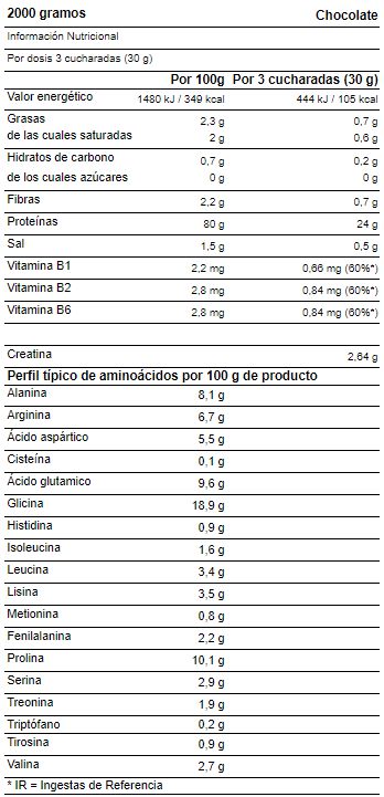 Proteína de carne de vaca hidrolizada, monohidrato de creatina, polvo de cacao, sabores, edulcorante: sucralosa, vitamina B6 (piridoxina HCl), vitamina B1 (tiamina HCl), vitamina B2 (riboflavina).