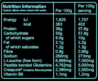 Otros ingredientes: polímeros de glucosa, DH hidrolizado de suero, L-leucina, peptidos de glutamina, monohidrato de creatina Creapure, alanina beta, saborizantes naturales, la carboximetil celulosa, tintes naturales, cloruro de sodio, edulcorantes artificiales (sucralosa SPLENDA, acesulfamo K) y la vitamina B6.