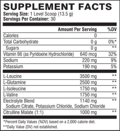 L-Leucina, L-Glutamina, L-isoleucina, L-valina, Mezcla de electrolitos (Citrato de sodio, cloruro de potasio, cloruro de sodio), Malato de citrulina (1: 1), Vitamina B6 (como clorhidrato de piridoxina).