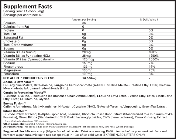 Red Alert ™ no sólo proporcionará unos bombeos increíbles, si no que también le dará la concentración suficiente para estar alerta y para mantener sus niveles de energía por las nubes durante todo su entrenamiento.