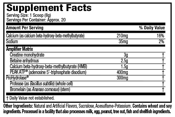 Monohidrato de creatina, Betaína anhidra, Beta-hidroxi-beta-metilbutirato de calcio (HMB), PEAK ATP® (adenosina 5'-trifosfato disódico), ProHydrolase®, Proteasa (como Bacillus subtilis) (célula completa), Bromelina (como Ananas comosus) (tallo).