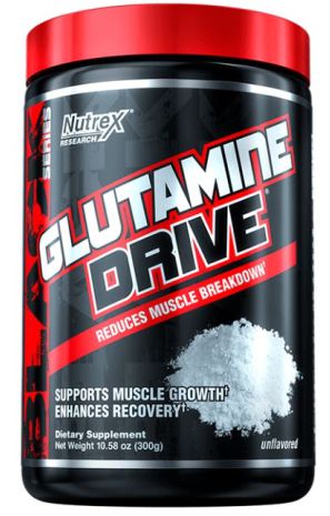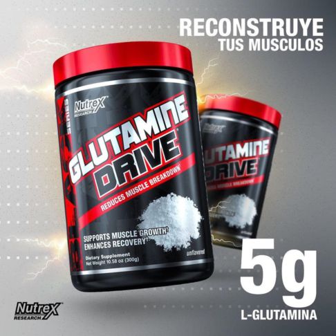 Glutamine Drive de Nutrex Research es un suplemento en polvo que contiene el 100% de glutamina de gran calidad y sin sabor para que la puedas agregar fácilmente a cualquier bebida después del entrenamiento para mejorar en gran medida la reparación muscular y estimular su cuerpo para un mayor crecimiento del tejido muscular.