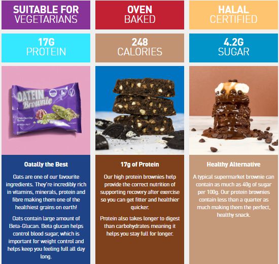 Oatein Brownie proporciona carbohidratos de bajo IG y la increíble cantidad de 17 gramos de proteína por unidad de 60 gramos, lo que lo convierten en el snack perfecto para tomar en cualquier momento del día para apoyar un estilo de vida saludable.
