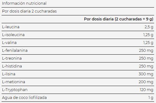 L-leucina, L-isoleucina, L-valina, agua de coco liofilizada (de la fruta Cocos nucifera L.), acidificante: ácido cítrico; Clorhidrato de L-lisina, estabilizadores: ésteres de sacarosa de ácidos grasos, hidroxipropilmetilcelulosa; L-treonina, L-fenilalanina, L-histidina, aromatizante, L-metionina, L-triptófano, edulcorantes: sucralosa, acesulfama K; agente antiaglomerante: dióxido de silicio; tinte: carotenos.